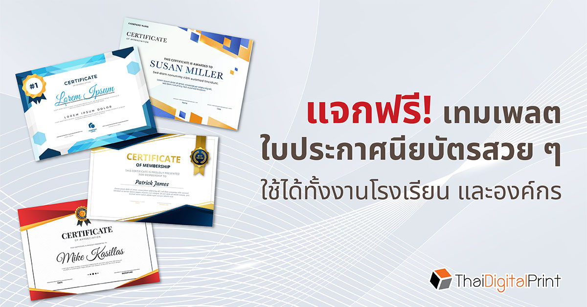 สนใจดาวน์โหลดเทมเพลตฟรี และสอบถามข้อมูลเพิ่มเติมเกี่ยวกับบริการพิมพ์ใบประกาศนียบัตรได้ที่ บริษัท ThaiDigitalPrint.com เรารับออกแบบ และผลิตใบประกาศนียบัตร ทุกรูปแบบ ทุกประเภท โดยไม่จำกัดจำนวนขั้นต่ำ ยิ่งพิมพ์จำนวนเยอะ ราคาต่อชิ้นยิ่งถูก เรารับประกันงานพิมพ์คุณภาพด้วยทีมงานผู้เชี่ยวชาญด้านงานพิมพ์ ใส่ใจในทุกขั้นตอนการพิมพ์เพื่อคุณภาพของงานพิมพ์ที่ดีที่สุด